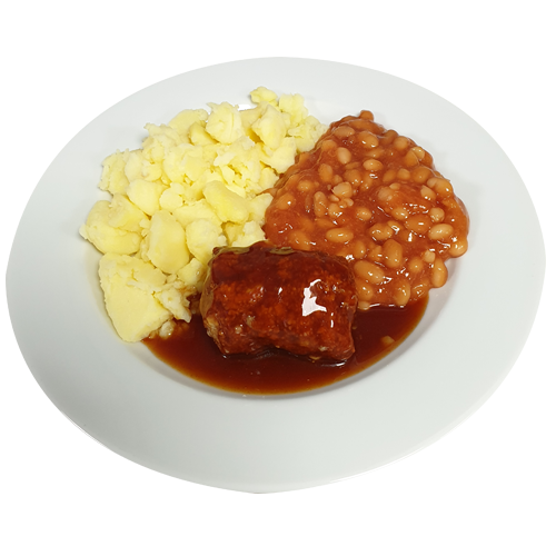 Boomstam (v) vleesjus,witte bonen in tomatensaus  en aardappelen gekookt