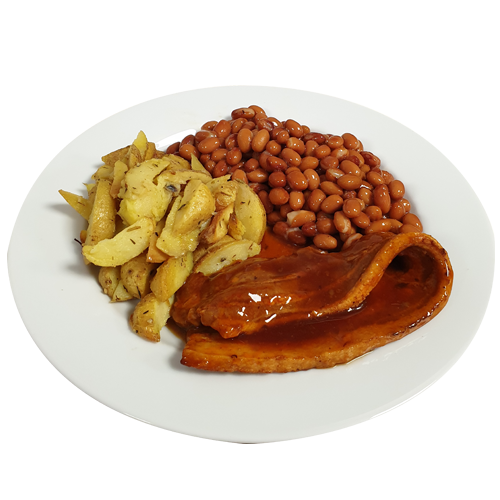 Speklap (v), vleesjus Bruine bonen Provençaalse aardappelen (natrium/zoutarm)